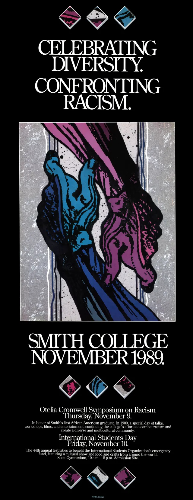 Initially, the committee considered inviting a keynote speaker. Notes from September 18, 1989, list novelist Maxine Hong Kingston, writer and civil rights activist Maya Angelou, journalist Connie Chung, attorney and activist Elaine Jones, and author Paule Marshall as possibilities.14 Instead, the committee decided to host a panel of Smith-affiliated speakers. The “keynote session,” which took place in John M. Greene Hall, featured President Dunn in conversation with students, faculty, staff, and alums on “The State of the College: Celebrating Diversity, Confronting Racism.”15 Professor Taitetsu Unno, who participated on the planning committee and panel, suggested the tagline “Celebrating Diversity, Confronting Racism,” which also graced the poster for the day, designed by John Eue of College Relations.16 Panelists answered Dunn’s questions about their own “personal observations of racism” and whether racism can be “reversed by education.”17