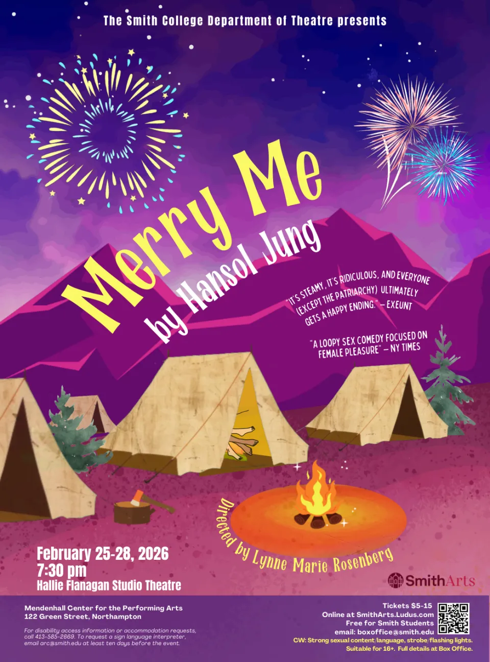 Merry Me is set in a military encampment between the sea and the mountains “in the Year of an Ongoing War.” The power is out, fighting is paused, and the troops are getting punchy and letting off steam. The cast of 7 portray General Memnon and his wife Clytemnestra, their son Pvt. Willy Memnon and his wife Sapph, the camp Lothario Lt. Shane Horne, and her therapist Dr. Jess O’Nope who is visited by an Angel. Some people get lucky and some get left behind, but there is a happy ending for all. Set Designer Gabriella Rosenberg ’27 has created a cross between a military base in an endless war and a campsite removed from time. Rex Tans ’25 returns to Smith to design the costumes, with faculty Lighting Designer Lara Dubin, and sound design by Emma McRedmond ’26. The puppets who bring to life the sexier scenes were created by Franny Brady ’27. The result is what the New York Theatre Guide called “Joyous… an entertaining, energizing and unmissable queer comedy.” Audiences should know that the play contains graphic sexual language and content and is suitable for people 16+. Full content details and tickets ($5-15) at smitharts.ludus.com.