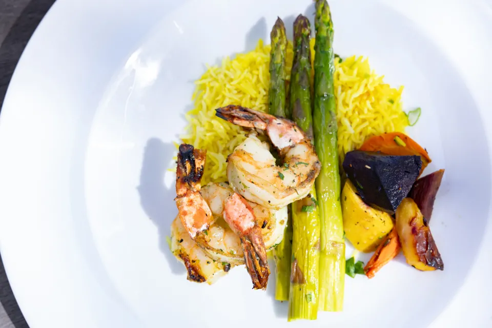 The first Meal Club in September featured a menu of green salad, jumbo grilled shrimp with wasabi ginger crema, chickpea panisse, roasted asparagus, and rainbow carrots.